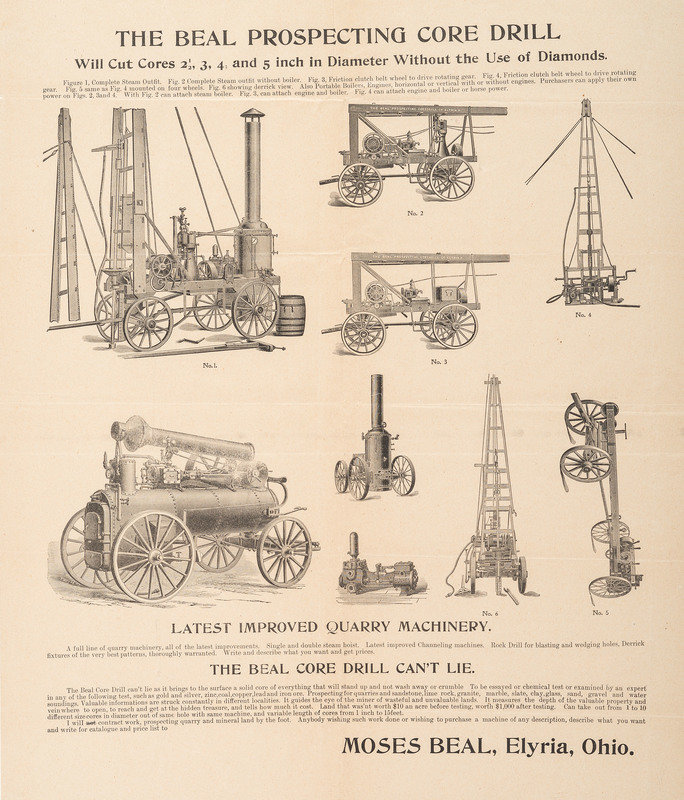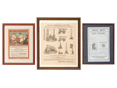 [With:] The Beal Prospecting Core Drill. Elyria, OH: N.p., [1890s]. 16 1/4 x 19 1/4 in. printed broadside (creasing, original folds); framed to 20 x 24 in. (not examined out of frame). Corresponding illustrated envelope, postally used, included on frame verso. Illustrated with several types of machinery. An article in the 11 August 1895 issue of the San Francisco Call reports on oil prospecting: "A Beal Prospecting Core Drill, the same as those used in sinking oil wells in the East and the only one in California, will be set up on the property."