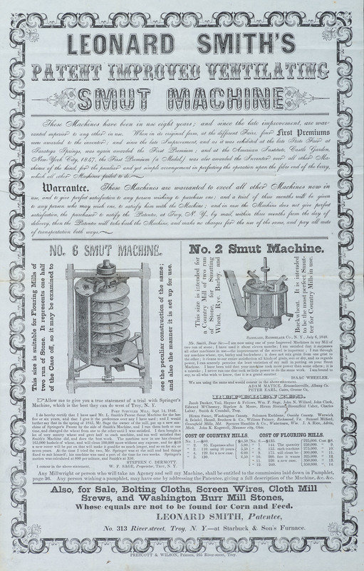 Leonard Smith's Patent Improved Ventilating Smut Machine. Troy, NY: Prescott & Wilson, [1857?]. 10 x 15 3/4 in. printed broadside on blue paper (minor toning along original folds); framed to 14 3/4 x 19 in. (not examined out of frame). Illustrated with two model numbers. Advertisements are published in several 1857 issues of the Edgefield Advertiser [Edgefield, SC].