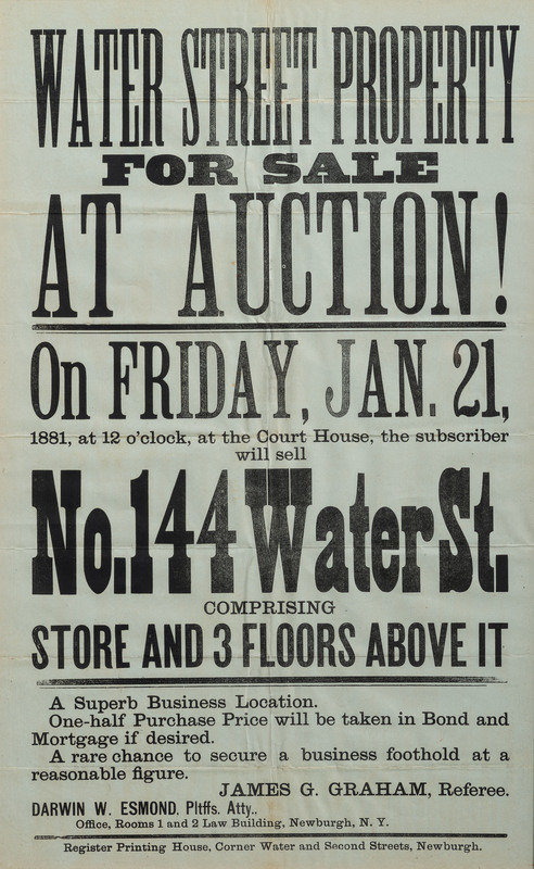 [With:] Water Street Property for Sale at Auction! Newburgh, NY: Register Printing House, 21 January 1881. Visible 11 1/2 x 18 1/2 in. printed broadside, framed to 15 x 22 in.