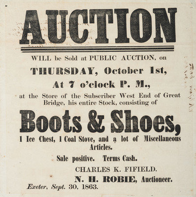 Auction...Boots and Shoes. Exeter, NH: 30 September 1863. 11 1/4 x 11 1/2 in. printed broadside, framed to 15 x 15 in. (not examined out of frame). Appears to be manuscript notes to verso.