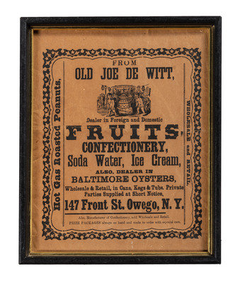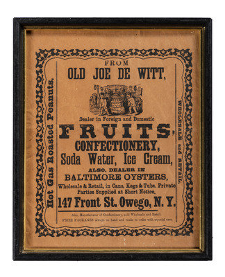 [With:] From Old Joe De Witt, Dealer in Foreign and Domestic Fruits, Confectionary, Soda Water, Ice Cream. Oswego, NY: N.p., n.d. Visible 7 5/8 x 9 5/8 in. printed advertisement (toned); framed to 8 7/8 x 11 in. Illustrated with a vignette of cherubs with a wedding cake. Believed to be printed on the side of a bag.
