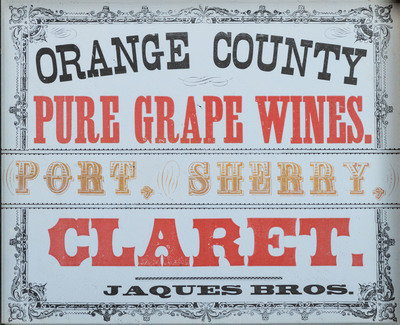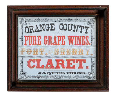 Orange County Pure Grape Wines. Port, Sherry, Claret. [Orange County, NY]: N.p., n.d. Visible 10 3/4 x 9 3/4 in. broadside printed in black, red, and gilt; framed to 14 x 12 in. (not examined out of frame). Signed in type by Jacques Bros.