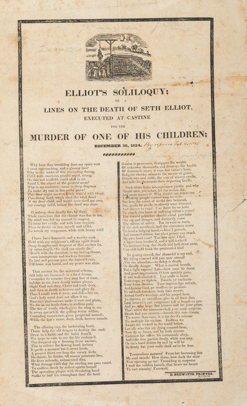 A printing of the final words of Seth Eliot, a man convicted of murdering his own child. An act he attributed to his own intemperance and which he gave a soliloquy recorded here in verse. An article published on 1 March 1825 in the Hartford Courant remarks on the hanging and Elliot's address from the gallows.