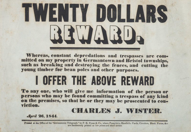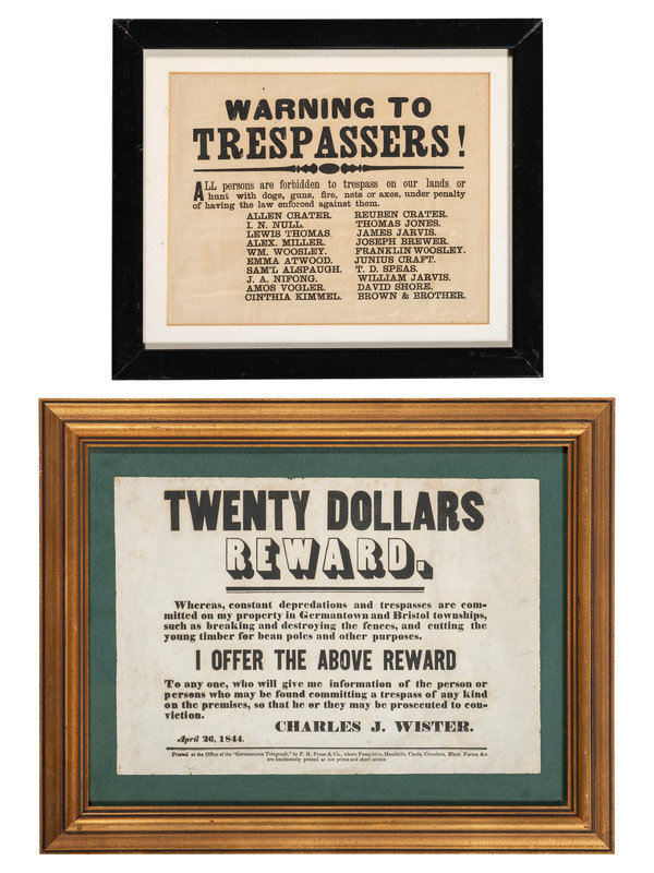 [CRIME & PUNISHMENT]. A group of 2 broadsides announcing a reward and warning to trespassers, incl. "Twenty Dollars Reward" issued to Germantown and Bristol Townships, Pennsylvania, by Charles J. Wister, 1844.