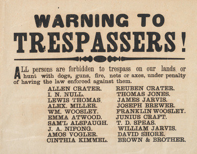 [With:] Warning to Trespassers! All persons are forbidden to trespass on our lands, or hunt with dogs, guns, fire, nets and axes, under penalty of having the law enforced against them. [Winston-Salem, NC?]: N.p., n.d. Visible 10 1/2 x 8 in. printed broadside (toned, small separation); matted and framed, 13 3/4 x 11 1/2 in. (not examined out of frame). Signed in type by 20 men and women.