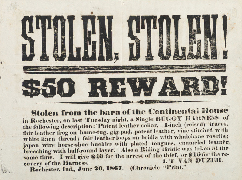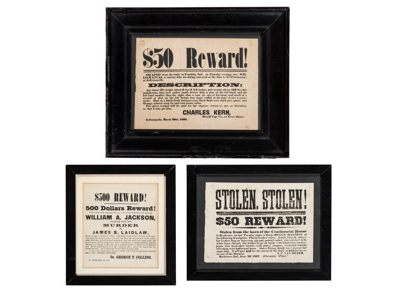 [Also with:] Stolen. Stolen! $50 Reward! Rochester, IN: Chronicle "Print," 20 June 1867. 11 x 8 1/8 in. printed broadside (minor offsetting); framed to 14 1/2 x 11 1/2 in. (not examined out of frame. Signed in type by I.T Van Duzer.