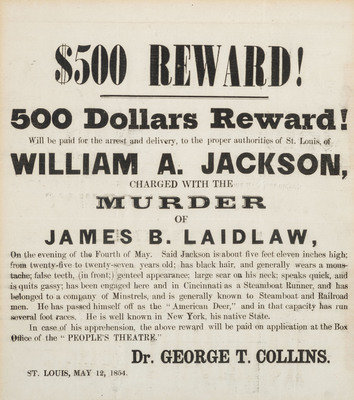 $500 Reward. William A. Jackson. Charged with the Murder of James B. Laidlaw. St. Louis, MO: N.p., 12 May 1854. Visible 7 1/2 x 8 1/2 in. printed broadside (minor toning); matted and framed to 11 x 12 in. (not examined out of frame). Signed in type by Dr. George T. Collins.
