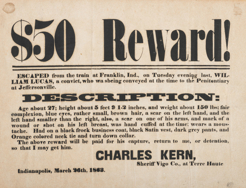 [With:] $50 Reward! Escaped from the train at Franklin, Ind., on Tuesday evening last, William Lucas, a convict... Indianapolis, IN: N.p., 26 March 1863. 12 1/2 x 9 1/8 in. printed broadside (toned); framed to 18 x 15 in. (not examined out of frame). Signed in type by Charles Kern, Sherrif of Vigo County.