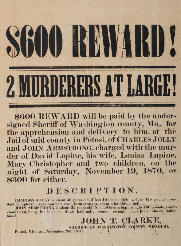 A reward broadside for the "apprehension and delivery" of Charles Jolly and John Armstrong who were accused of murdering 5 members of the Lapine family on 19 November 1870. The devastating murders by the men, identified as miners by the St. Joseph Saturday Herald (3 Decemb er 1870), caused a sensation across the state. They were apparently apprehended not long after the issuance of this reward broadside and while held in custody in Washington county, "infuriated citizens...attempted to lynch them on the 27th." (St. Joseph Herald, 3 December 1870). For their own protection, they were taken to St. Louis the next day where they were tried, and "after an absence of only three minutes, the jury returned a verdict of murder." (Buffalo Reflex [Buffalo, MO], 28 January 1871). They were duly hanged on 27 January 1871. (Kansas City Journal, 29 January 1871).