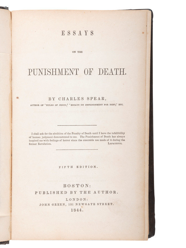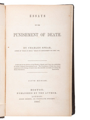 SPEAR, Charles (1803-1863). Essays on the Punishment of Death. Boston and London: By the Author and John Green, 1844. 8vo. Frontispiece. (Occasional spotting, minor toning.) Original brown cloth (recased, original cloth laid down, some losses at extremities). Fifth edition collection of the Unitarian minister's essays against the death penalty. Sabin 89066.