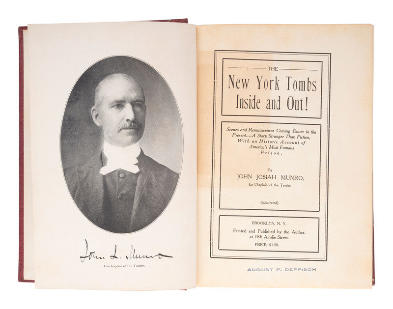 [With:] MUNRO, John Josiah. The New York Tombs Inside and Out! Brooklyn, NY: By the Author, 1909. 8vo. Photographic plates and frontispiece. (Some toning.) Original red cloth, spine titles gilt (very minor staining). FIRST EDITION.