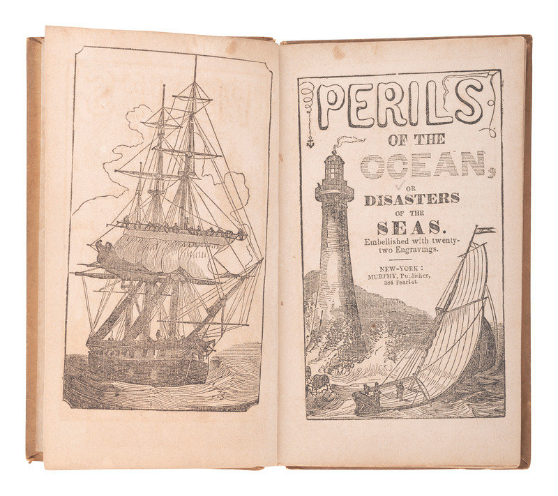 Perils of the Ocean, or Disasters of the Seas. New York: Murphy, [ca 1840-1850]. 16mo. Embellished with engravings. (Minor toning, offsetting.) Original illustrated boards (soiling, some chipping at spine).