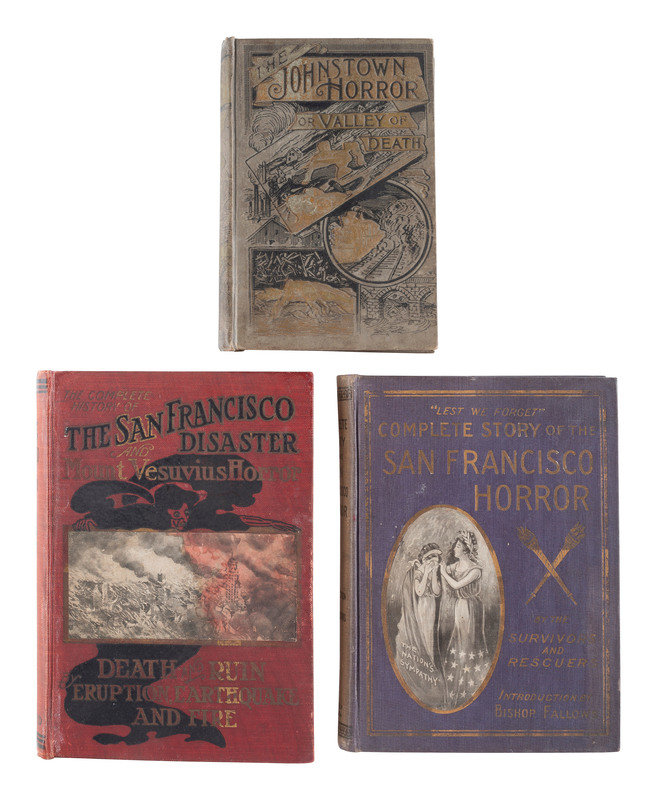 [With:] BANKS, Charles Eugene and Opie READ. The History of the San Francisco Disaster and Mount Vesuvius Horror. [Chicago]: C.E. Thomas, 1906. 8vo. Photographic plates. (Minor toning.) Original illustrated red cloth gilt with lithographed pastedown (staining, spine sunned). With 1906 gift inscription.