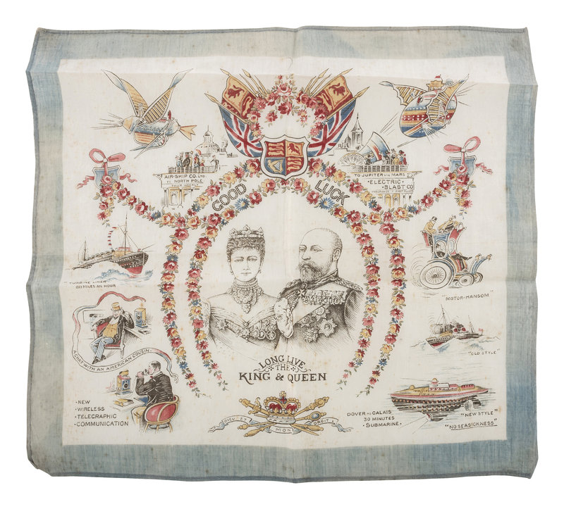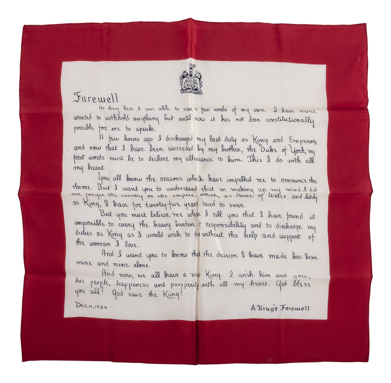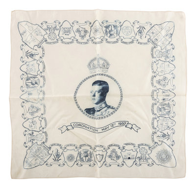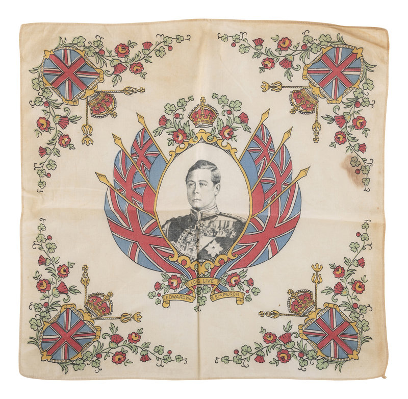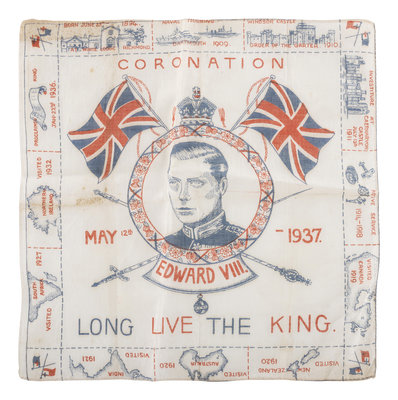 Edward VIII / Coronation /12th May 1937. England: Wedgwood, 1936. Height 4 1/2 in. ceramic cup. -- Coronation. May 12th 1937 Edward VIII. Long Live the King. 11 3/8 x 11 1/8 in. color printed cotton handkerchief with portrait and notable events in the King's life. -- Coronation May 12th 1937. 17 1/4 x 17 in. printed silk scarf with portrait and border with the constituent nations of the Empire's coats of arms. -- Long Live Edward VIII Emperor. 12 3/8 x 12 in. color printed cotton handkerchief. -- A King's Farewell. 19 x 19 in. printed silk handkerchief with facsimile farewell letter.
