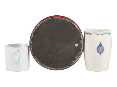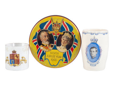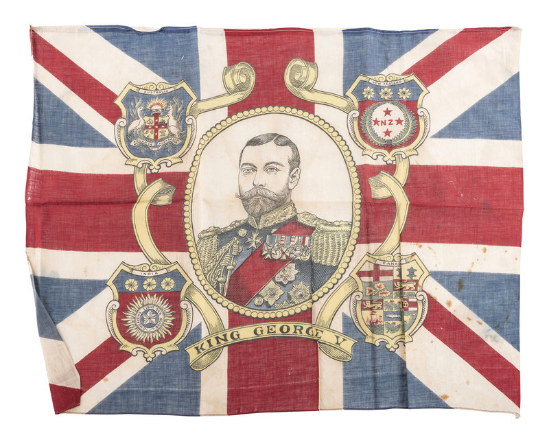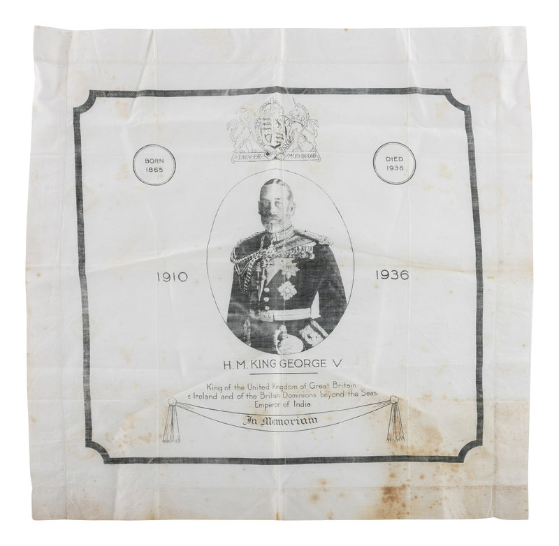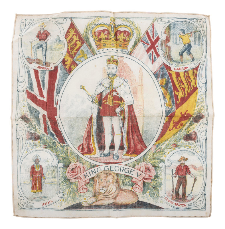 George V / Mary / 1911. Height 2 3/4 in. ceramic cup. -- King George V. 12 x 12 5/8 in. color printed cotton handkerchief with portrait at center surrounded by vignettes representing the Empire. -- Long Live the King & Queen. 14 3/4 x 13 1/2 in. color printed cotton handkerchief with jugate portrait and vignettes of technological advancements. -- King George V and Queen Mary. Silver Jubilee Year 1935. Diam. 6 in. printed tin with jugate portrait. -- King George V. 28 x 22 3/8 in. color printed cotton flag with King George superimposed over the Union flag with the coats of arms of Australia, New Zealand, Canada, and India. -- Hon Soit Qui Mal Y Pense Dieu et Mon Droit. 20 1/2 x 24 1/2 in. color printed cotton handkerchief. -- H.M. King George V...In Memoriam. 17 1/4 x 17 1/2 in. printed cotton handkerchief with portrait.