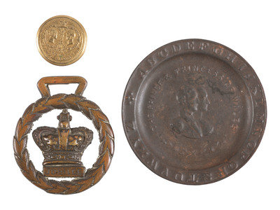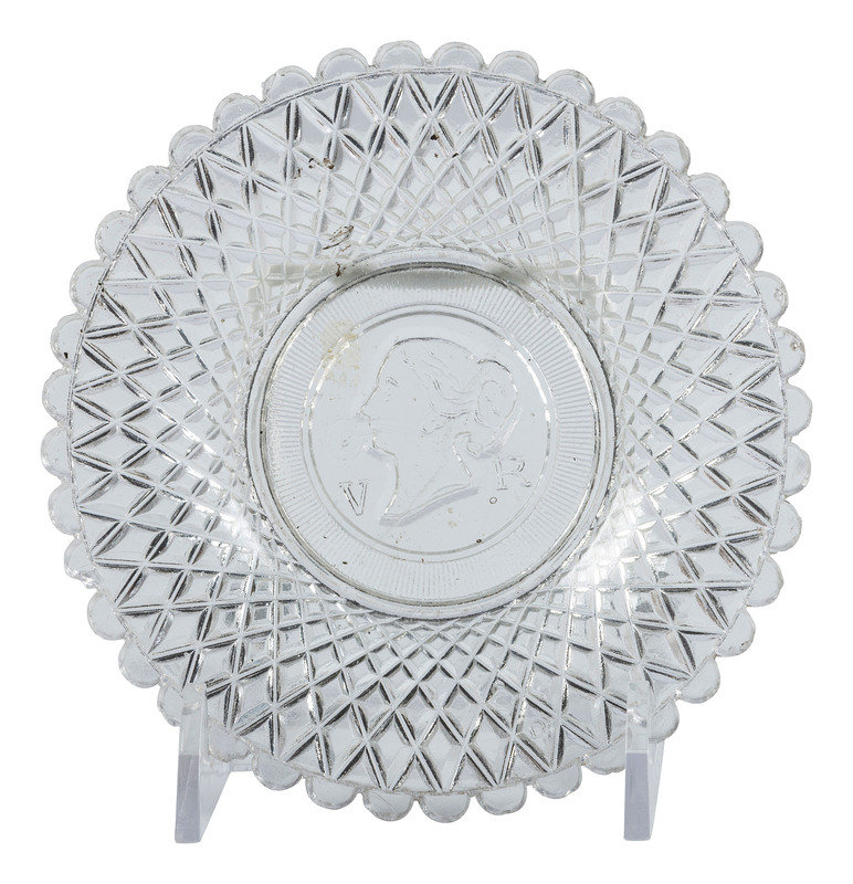 Pressed glass plate with bust profile portrait of Queen Victoria with "VR". Diam. 4 5/8 in. -- Brass lidded mint tin featuring jugate portraits of Victoria and Albert. Diam. 1 1/2 in. -- Jubilee horse brass. Approx. diam. 3 in. -- The Prince and Princess of Wales. Diam. 4 1/4 in. pressed tin plate (corrosion).
