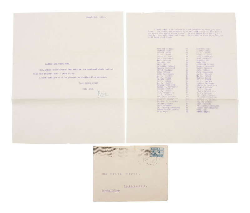 [Also with:] Copy of a chain letter sent from Stig Arpi to Greta Garbo, with cover. This letter only promised good luck if one sent it on immediately. It did not ask for money or other inclusions with the letter. Others in the “chain” included Bernard Shaw, Henry Ford, Col. Lindbergh, John Barrymore. Cover postmarked 1930, with Argentinian stamp.