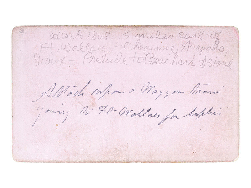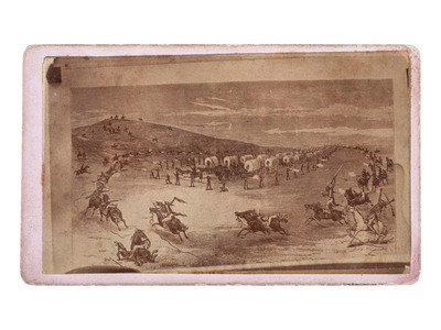 2 1/4 x 3 3/4 in. CDV on cardstock mount (some darkening to image, with soiling and wear to edges, mount with significant soiling and wear to edges and corners). Verso bears period ink inscription reading, "Attack upon a Waggon [sic] train going to Ft Wallace for suplies [sic]," and modern pencil inscription, "attack 1868 15 miles east of Ft. Wallace. - Cheyenne, Arapaho, Sioux - Prelude to Beecher's Island." The illustration features a wagon train encircled by Native American warriors on horse.