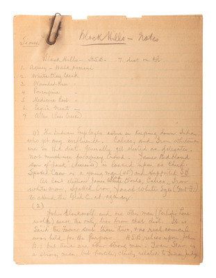 "Black Hills - Notes." Manuscript notes, pencil on lined paper, by unidentified author. 7pp, 8 x 10 in. (heavy toning, brittle paper, oxidized metal clasp). Notes provide specific details on individuals residing at Wahkpamini, White Clay Creek, Wounded Knee, Porcupine, Medicine Root, Eagle's Nest, and Allen (Pass Creek) Districts of the Pine Ridge Indian Reservation with a focus on their past and present political affiliations.