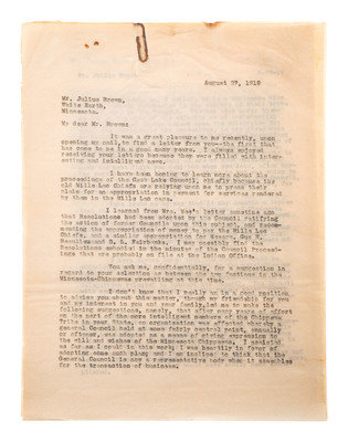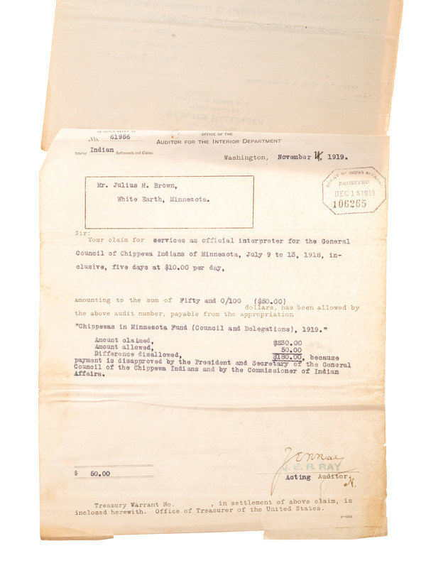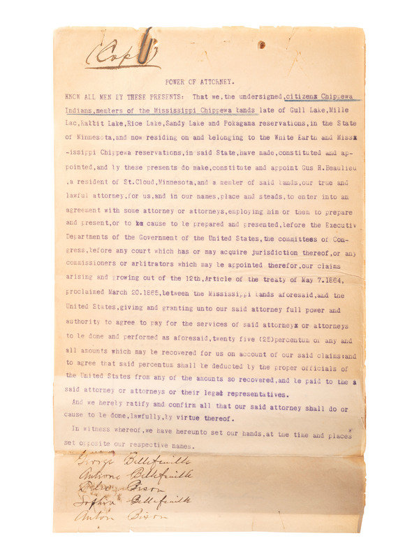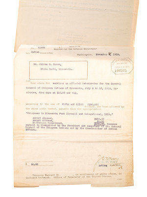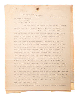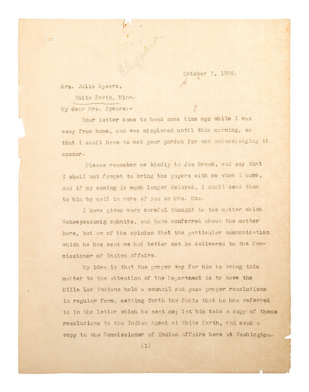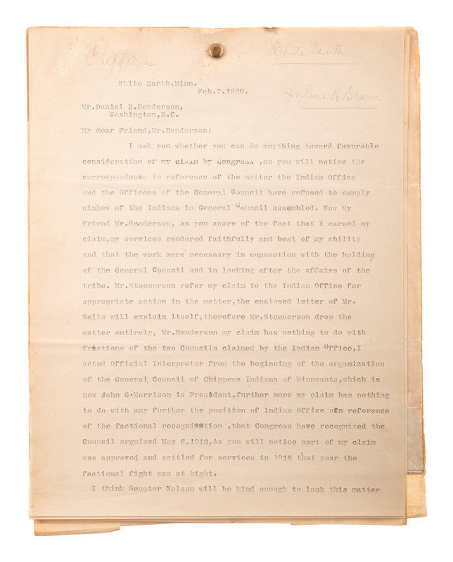 [Also with:] A group of 6 documents and pieces of correspondence related to Chippewa Indians, some addressed to attorney Daniel Henderson and associated with his work representing the legal interests of various Indian tribes.
