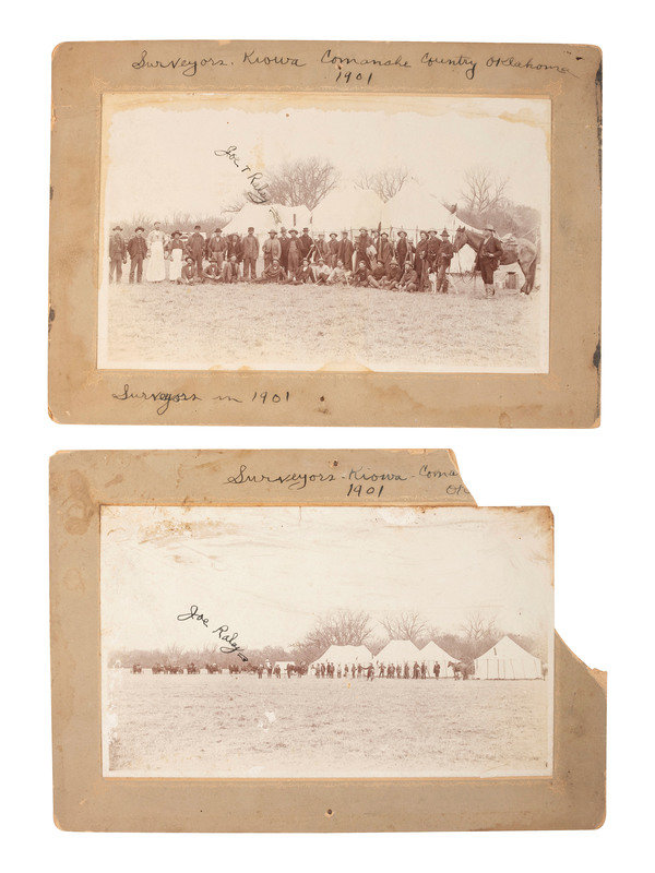 Group portrait of surveyors arranged in two rows, seated and standing, in front of a a few large tents. One of the men is identified as Joe T. Raley by inscription on image. Inscriptions to mount recto read, "Surveyors, Kiowa Comanche Country Okalahoma 1901" and "Surveyors in 1901." (Discoloration to edges of image, wear an ddiscoloratio nto mount.) -- Group portrait of likely the same group of surveyors in the same location, taken from much farther away and showing horse-drawn wagons to the left side. Joe Rayley is identified by inscription on image in this example as well. Inscription, partly lost, on mount recto reads, in part, "Surveyors - Kiowa...1901." (Large section of loss to mount upper right, heavy soiling to upper area of image.) -- Together, 2 8 x 5 in. silver gelatin photographs on 10 x 7 in. cardstock mounts.