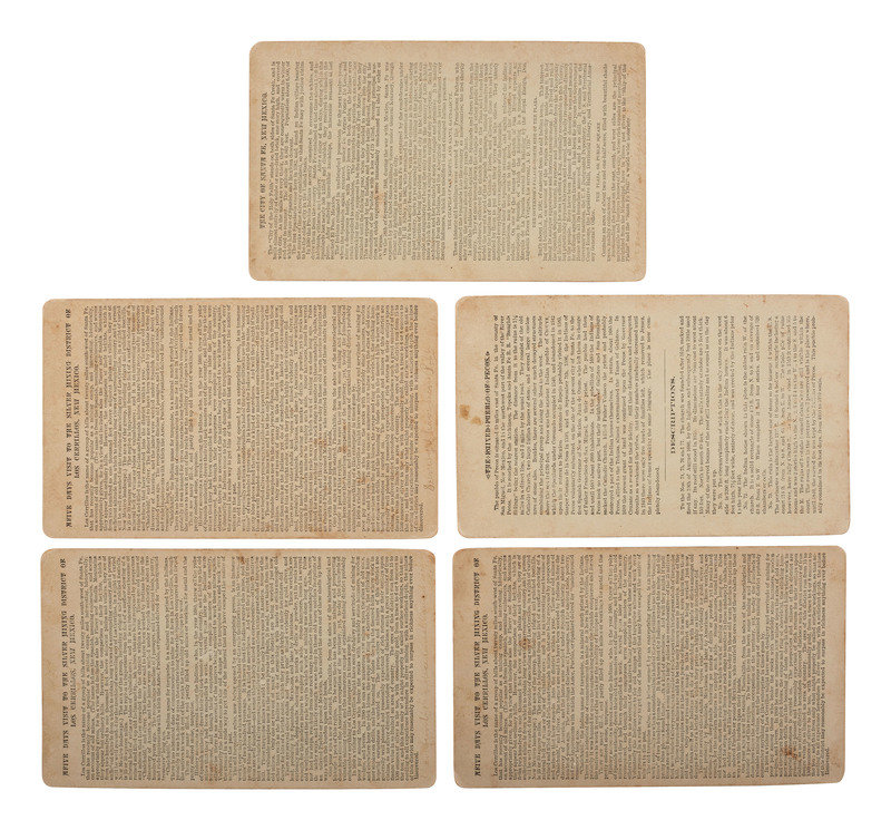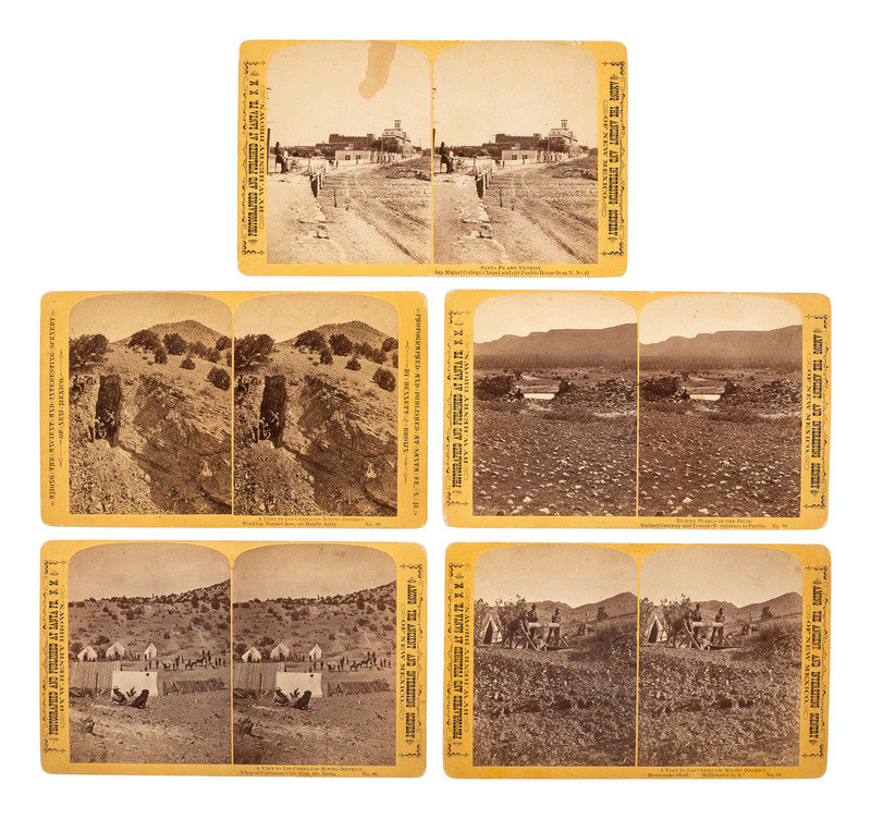 Santa Fe and Vicintiy. San Miguel College, Chapel and old Pueblo House from N. No. 42. (Brown stain to upper left.) -- Ruined Pueblo of the Pecos. Ruined Gateway and Towers-W. entrance to Pueblo. No. 70. -- A Visit to Los Cerrillos Mining District. View of Carbonateville from the East. No. 86. -- A Visit to Los Cerrillos Mining District. "Homestake Shaft." "Millionares [sic] in it," No. 98. -- A Visit to Los Cerrillos Mining District. Working Tunnel face, on Handy Andy. No. 99. -- Together, 5 stereoviews, each approx. 5 7/8 x 4 in., on 7 x 4 1/4 in. yellow cardstock mounts, photographer imprint and series titles printed to mount rectos, essays on each view printed to mount versos, condition generally very good, minor toning. minor bumping to mounts.