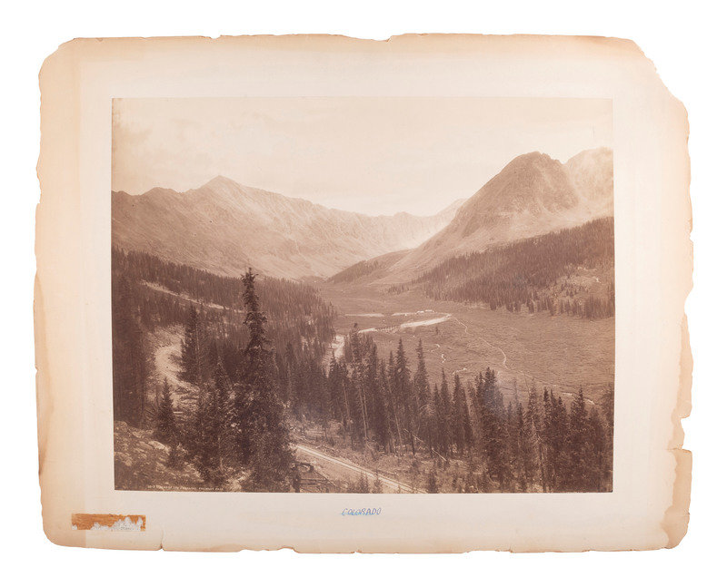 Head of the Arkansas, Fremont Pass. 16 3/4 x 21 1/4 in. albumen photograph on 22 x 28 in. cardstock mount (some toning to print and mount; corner and edge wear to mount, including chipping and areas of loss, remnants of typed label in lower margin). Title and credit to W.H. Jackson & Co. written in the lower margin of negative. "Colorado" written in blue ink in lower margin.