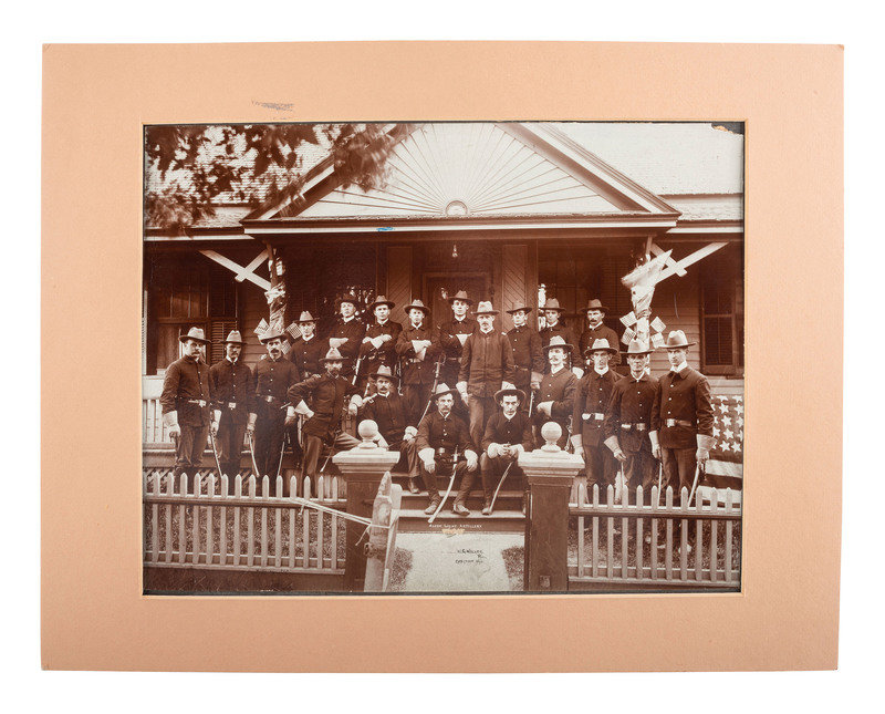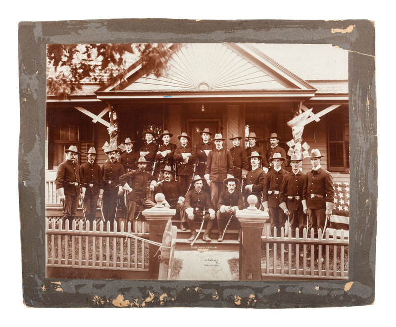 13 1/2 x 10 3/8 in. silver gelatin photograph on cardstock mount (spot of loss to lower central portion of image beneath identifiation, loss to upper right corner, ink stain to upper portion along roof; mount with significant paper and adhesive residue, and large pieces of duct tape with which it was previous attached to mat). Loosely housed in 18 x 14 1/4 in. modern cardstock mat. Unit identified in the negative, "Alger Light Artillery," with photographer credited just below, on image. A group of 20 uniformed men, many armed with swords, pose in two rows on the porch of a home outfitted with patriotic bunting and numerous parade flags.