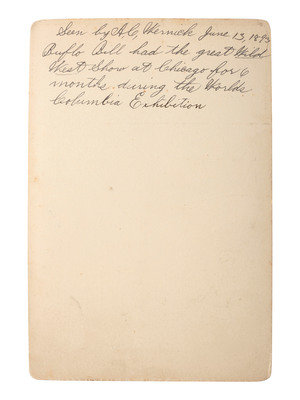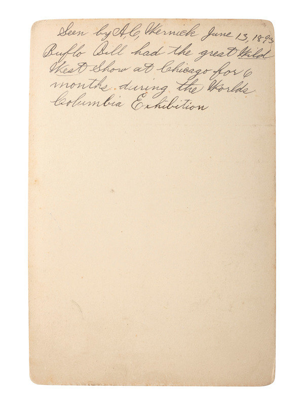 3 7/8 x 5 3/8 in. albumen photograph on cardstock mount (light toning, some spotting to upper left portion of image, mount with old tape to upper and lower edges). Brisbois' imprint on mount recto along with facsimile signature. Verso with ink inscription reading, "Seen by A.C. Wernick June 13, 1893 Buflo [sic] Bill had the great Wild West Show at Chicago for 6 months during the Worlds Columbia Exhibition."