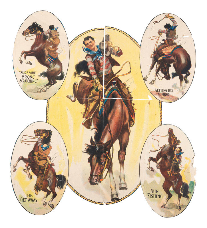 Die-cut lithographed poster, 38 x 43 in. overall, comprised of a central depiction of a cowboy on horseback, surrounded by 4 vignettes with captions, "Sure some Bronc' Scratching! / Getting his Number / The Get Away / Sun Fishing." Publisher unknown, but possibly a 101 Ranch Real Wild West Show poster (fully separated into 3 parts, overall poster with some creasing, edge wear, chipping, and some areas of edge loss).