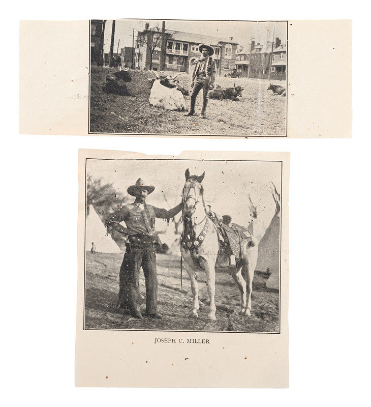 [With:] 2 clippings from a book or magazine, incl. an image of Joseph C. Miller with horse, and a cowboy, with partial text printed to versos.