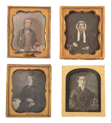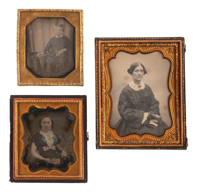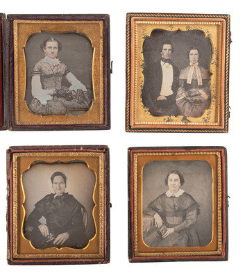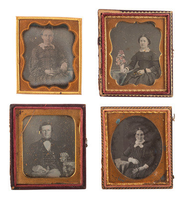 Quarter plate daguerreotype portrait of a woman wearing a black dress with lace collar and a brooch, and holding a cased image open with one hand. (Faint spotting to image, otherwise rather clear; resealed 1994.) Housed in a fully separated pressed paper case. -- Sixth plate daguerreotype portrait of a young boy holding what appears to be a cased image in one hand. (Tarnishing to edges, some spotting and fading to image; retains portions of original seals, under mat, glass, and preserver only.) No case. -- Sixth plate daguerreotype of a woman wearing a fine lace shawl and holding a gilt push-button image case in her hand. (Some tarnishing to edges, otherwise rather clear; resealed 1995.) Housed in a pressed paper case. -- And 20 others, all sixth plate daguerreotypes, some without cases, many without full cases. -- Together, 23 daguerreotype portraits of subjects holding cased images.