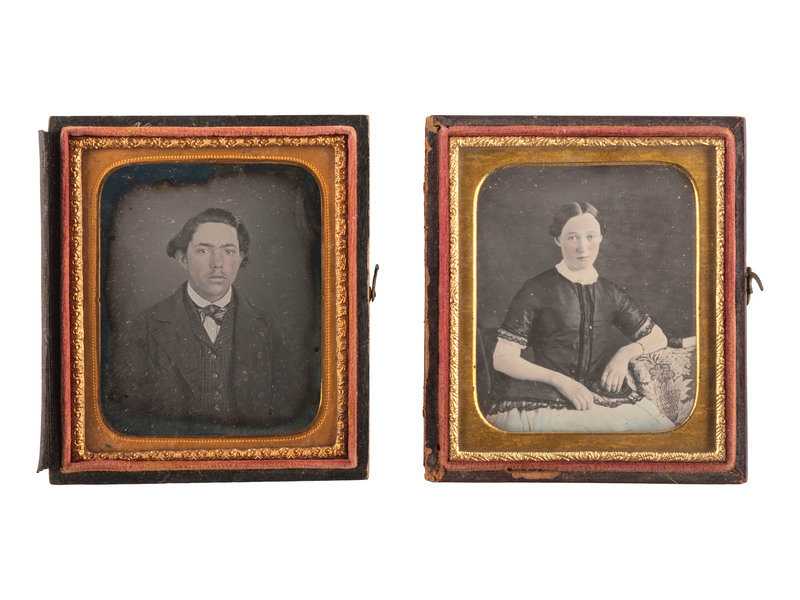 Portrait of a young man with long, curly hair. Woonsocket, RI: Goddard, ca 1855. (Tarnishing to edges, very light glass weeping and dust specs to image; original seals.) Housed in a fully separated pressed paper case. Mat stamped for Goddard. Penciled note in back of case reads, "Dexter H. Ball[i]n? / Feb 3rd 1855." -- Portrait of a young man with long hair, a slight unibrow, and a thin mustache, possibly of mixed race. (Significant tarnishing to edges, some splotching throughout; unsealed.) Housed in a fully separated pressed paper case. -- And 20 others, all sixth plate daguerreotypes, many without full cases. -- Together, 22 sixth plate daguerreotype portraits of young adults and teenagers.