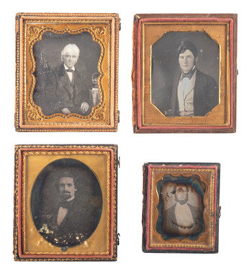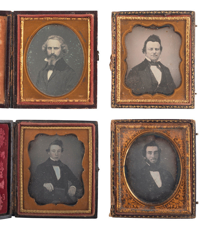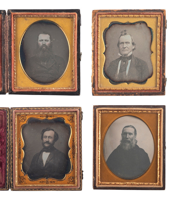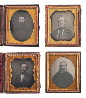 Sixth plate portrait of a man staring intensely into the camera, his long gray hair neatly coiffed and his facial hair combed. New York: Anson, n.d. (Spots of oxidation throughout plate, very light tarnishing to upper edge, spotting to mat; unsealed.) Housed in a pressed paper case (partial separation at spine). Mat and velvet pad marked for Anson. -- Sixth plate portrait of a man with long hair combed back, and a long and bushy beard, wearing some kind of robe. (Light tarnishing to edges, very minor spots and surface scratches.) Housed in a fully separated pressed paper case. -- And 10 others, including 9 sixth plate portraits and one ninth plate portrait, many without full cases. -- Together, 12 daguerreotypes of men with facial hair or interesting hairstyles.