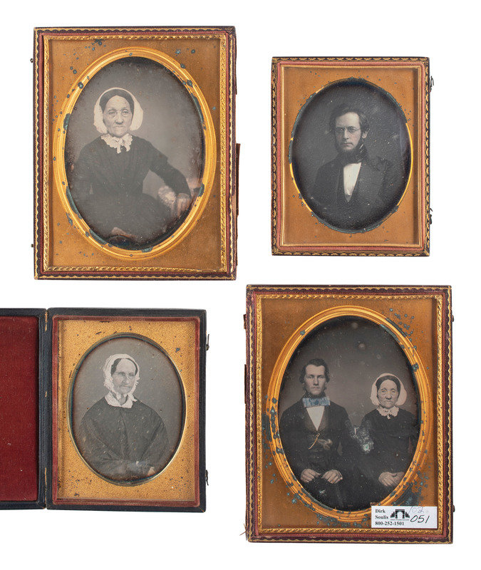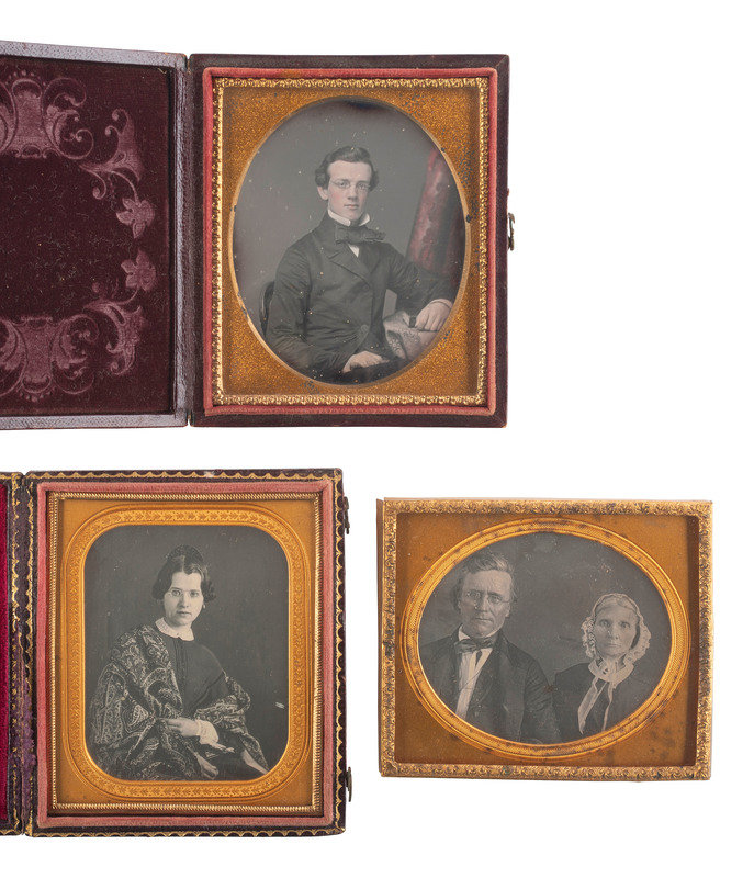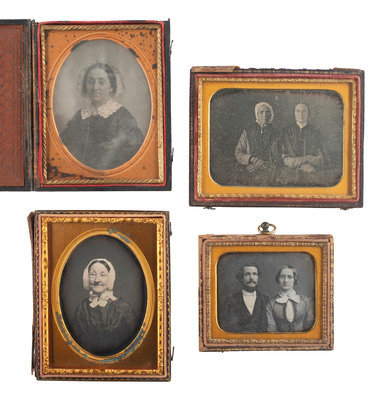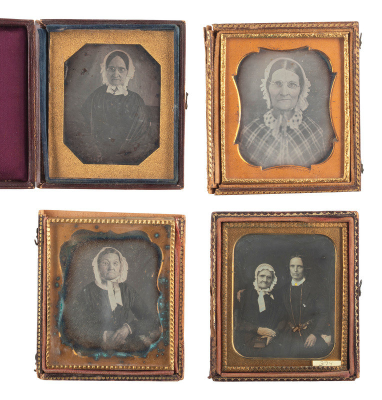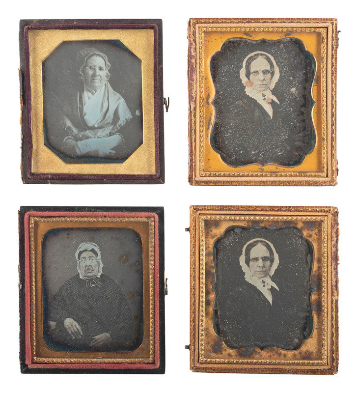 A pair of half plate portraits featuring the same elderly woman wearing a bonnet and glasses. (Both with tarnishing and oxidation spotting to images, spotting to mats; both retain portions of original seals.) Housed together in a fully separated pressed paper case. In one image, the woman is posed alone, while in the other she is seated next to a young gentleman. -- Sixth plate portrait of a lovely young woman wearing glasses and holding a patterned shawl around herself. (Minor streaks, very clear image; resealed.) Housed in a pressed paper case (nearly fully separated at spine). -- And 20 others, including 5 quarter plate examples and 15 sixth plate examples, many without full cases. -- Together, 23 daguerreotypes featuring a wide age-range of subjects wearing eyeglasses.