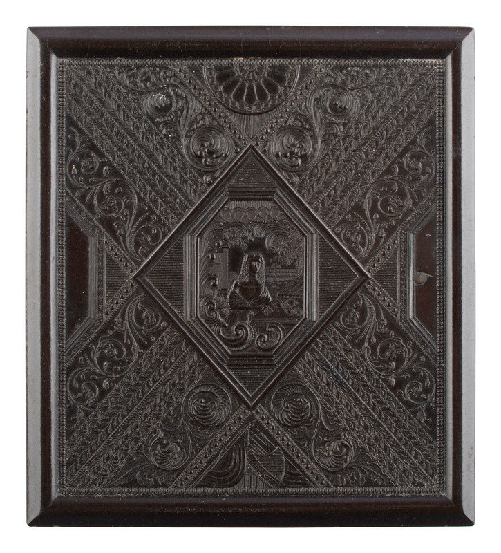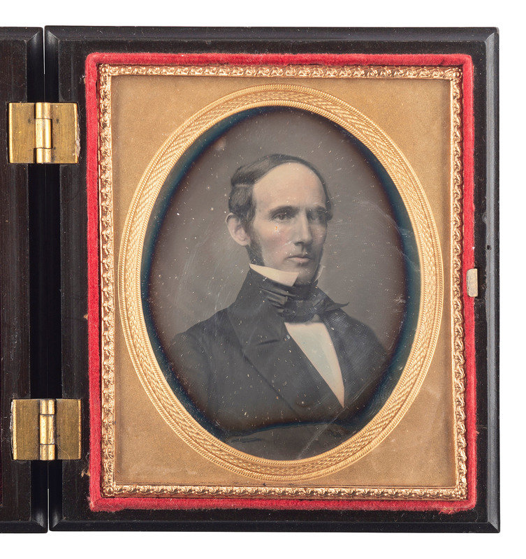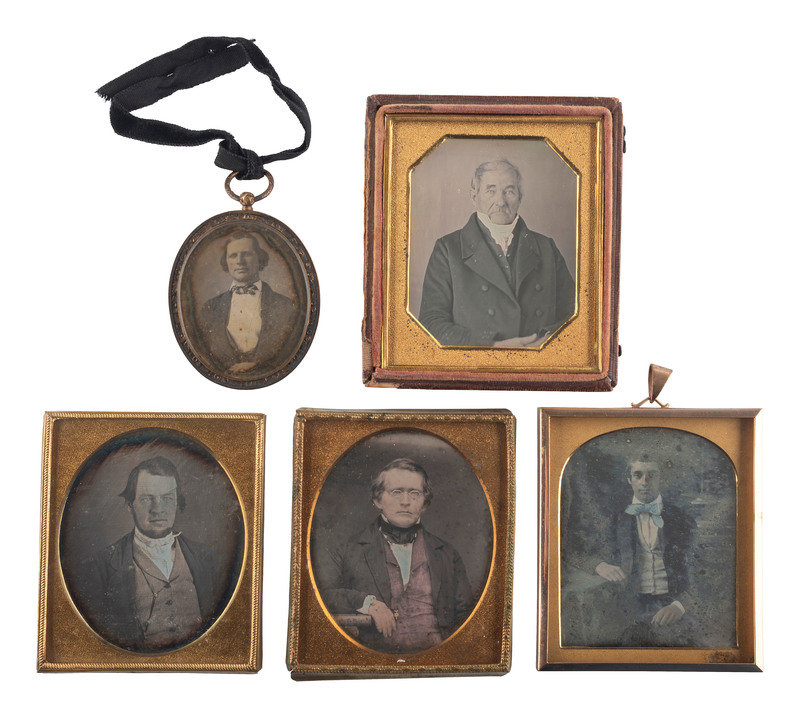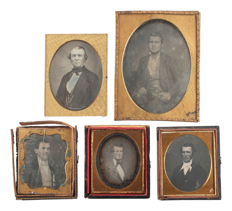 Sixth plate portrait of a distinguished gentleman with perfectly combed hair. (Tarnish to edges, some loss to bottom of image; retains some original seals.) Housed in a Rare Union case, Daguerreian Gallery [Berg 1-118] (some alignment issues, one hinge with breakage to surrounding thermoplastic). -- Sixth plate portrait of a gentleman wearing glasses and resting his arm on a stack of books, his vest hand-tinted red. (Tarnish and spottig throughout plate, spotting to mat and preserver; unsealed, under mat, glass, and preserver only.) No case. -- And 9 others, including one half plate example, one quarter plate example, 6 sixth plate examples, and one ninth plate example, some without cases. -- Together, 11 daguerreotype portraits of men.