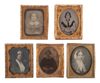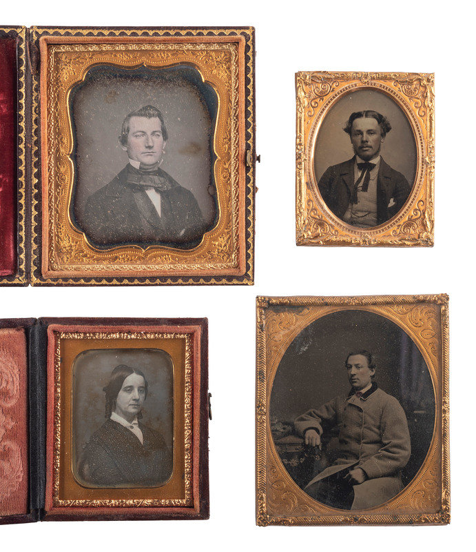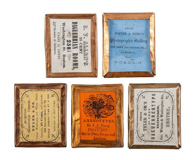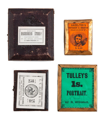 Sixth plate daguerreotype portrait of a gentleman. (Tarnishing to edges, spotting to plate; original seals.) Housd in a leatherette push-button case with advertising card for Dyer's Daguerreian Studio. -- Sixth plate ambrotype seated portrait of a gentleman wearing a double-breasted coat wth dark collar. (Some image loss to lower portion, spotting to mat and preserver; unsealed.) No case. Bright green advertising card for "Tulley's 1s. Portrait" behind image. -- Ninth plate ambrotype portrait of a gentleman wearing a checkered vest. (Some oxidation to mat and preserver; unsealed.) No case. Orange pictorial advertising card for Hazelton's Photograph & Ambrotype Gallery, Boston, behind image. -- And 6 others, including 4 ninth plate daguerreotypes and 2 ninth plate ambrotypes, most without cases. -- Together, 9 daguerreotype and ambrotype portraits with photographers' advertising cards.