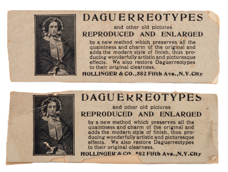 [With:] A pair of clipped and mounted 20th century printed advertisements for Hollinger & Co., NY. "Daguerreotypes and other old pictures Reproduced and Englarged b a new method which preserves all the quaintness and charm of the original and adds the modern style of finish, thus producing wonderfully artistic and picturesque effects." Each 3 1/2 x 1 1/4 in., with chipping and loss to edges.