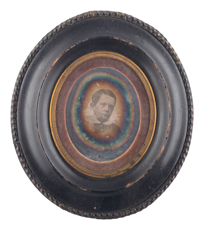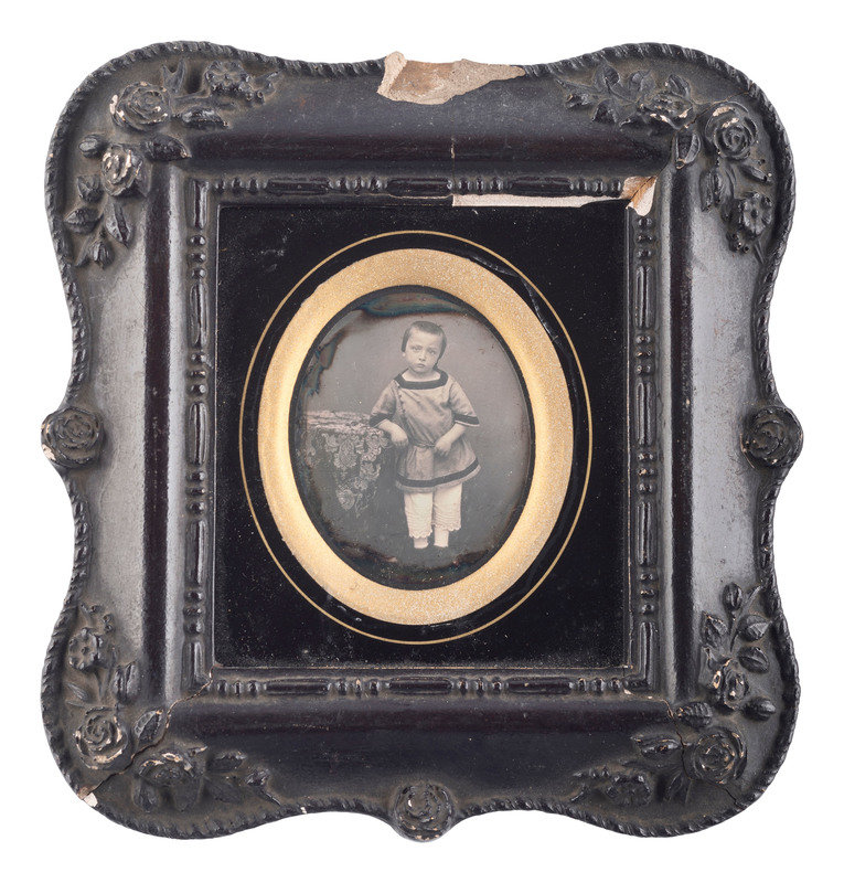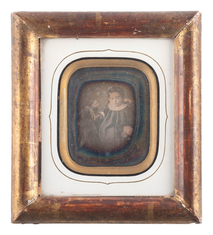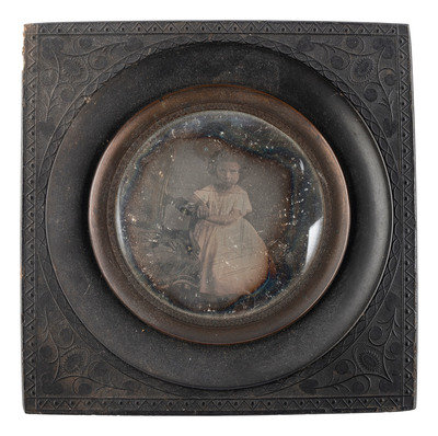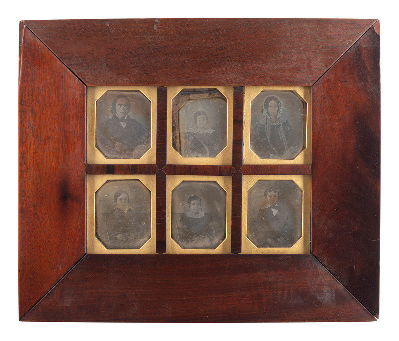 6 sixth plate daguerreotype portraits of likely family members including 2 adults and 4 children. (Tarnishing to all plate edges, clouding and halo effect to most plates; not examined out of frame.) Housed together in a 13 3/8 x 11 1/4 in. wooden wall frame. -- Approx. 2 1/4 in. diam. (sight) French daguerreotype portait of a young girl with an apprehensive expression, standing and resting her hands on the arm of a chair. (Heavy tarnishing and some spotting, affecting subject; not examined out of frame.) Housed in a 4 1/8 x 4 1/8 in. French frame with manufacturer sticker for "P. Gales," similar to a quarter plate frame listed as "European Style" [7-115G] in Berg (chipping and surface wear throughout). Verso with paper label identifying subject as "Gabrielle Lefib[ure?] de Fourig[?]" -- And 3 others, all daguerreotypes of children in frames, 2 having French labels on verso. -- Together, 10 daguerreotypes housed in frames.