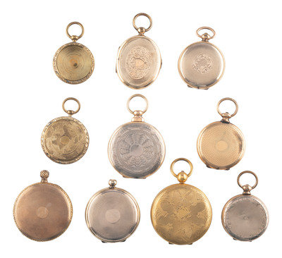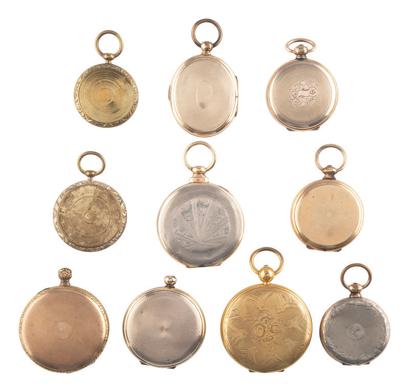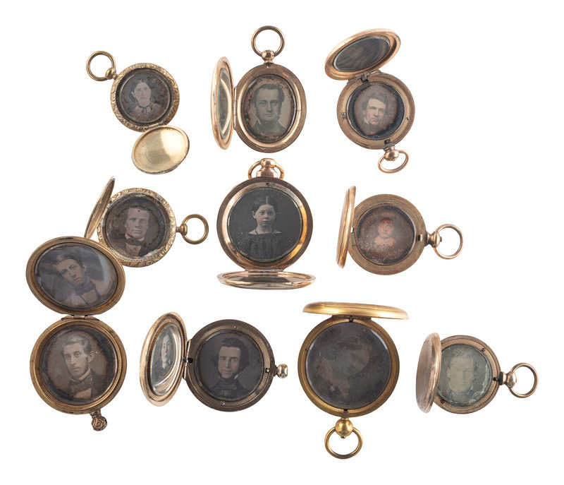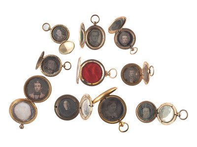 [EARLY PHOTOGRAPHY]. A group of 10 lockets containing 14 daguerreotypes of children and young men and women.
