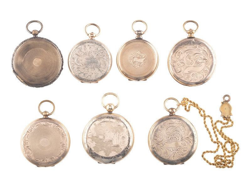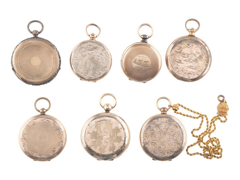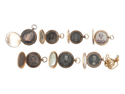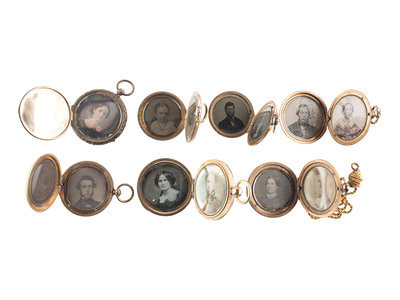[EARLY PHOTOGRAPHY]. A group of 7 lockets containing 13 daguerreotype, ambrotype, and tintype portraits.