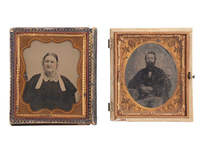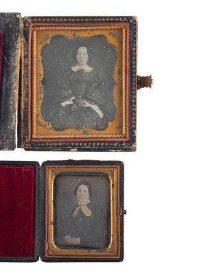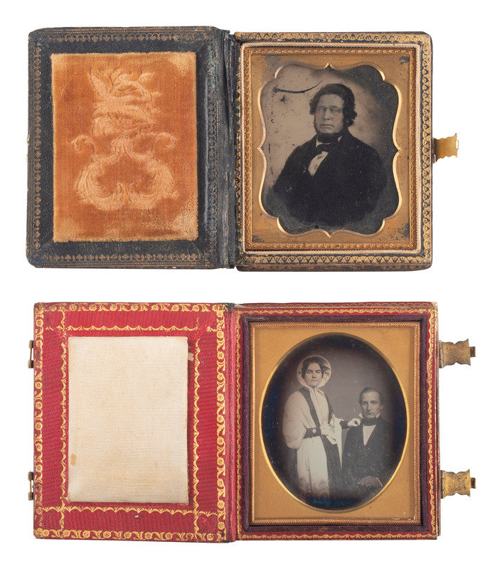 3 quarter plate-sized cases with hand painting and mother-of-pearl inlay (parts missing/broken on each), 3 sixth plate-sized cases with hand painting and mother-of-pearl inlay (surface wear to most, full separation in multiple areas to one), one sixth plate book-style case featuring mother-of-pearl inlay and containing an image of a couple, 2 ninth plate-sized cases including one featuring hand painting and mother-of-pearl inlay and the other featuring mother-of-pearl inlay (both with significant wear and some loss), one sixteenth plate case featuring mother-of-pearl inlay, and 3 other accessories/holders decorated with hand painting and mother-of-pearl inlay. -- Together, 13 assorted cases and accessories, some containing images. Conditions range from poor to fair.