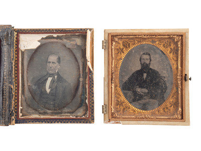 [With:] Additional half case with checkered mother-of-pearl inlay design, containing a sixth plate tintype of a bearded man.