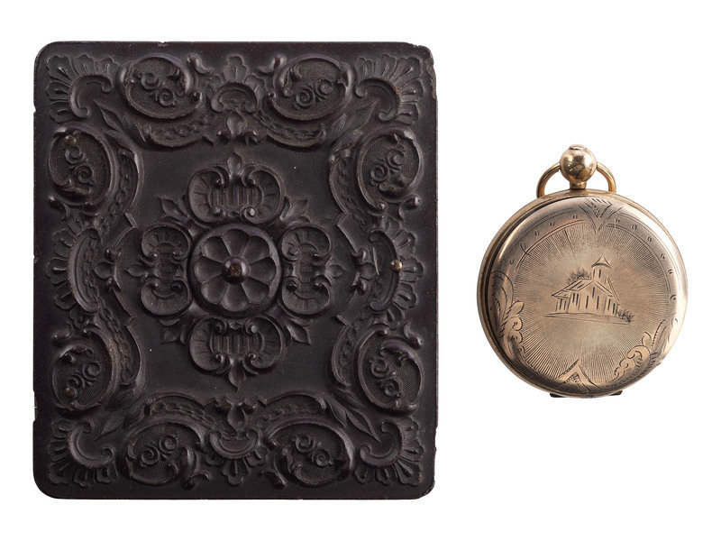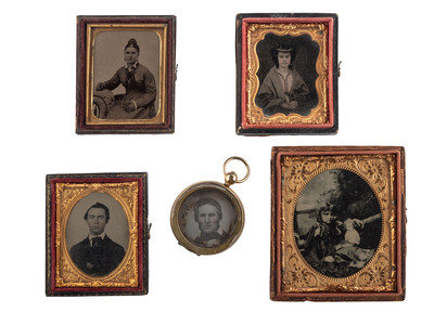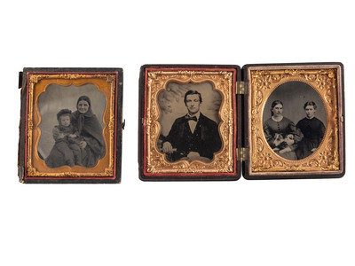 Sixth plate tintype portrait of two women, one holding on her lap a dog. (Notable blemish to upper right; unsealed.) Housed in a geometric Union case with a sixth plate ambrotype portrait of a young man wearing a printed vest and resting his hand on a book, posed against a painted backdrop. (Good contrast; unsealed.) -- Sixth plate ambrotype portrait of a woman wearing a large shawl and a cloth around her head, tied at her neck, and holding on her lap a child wearing a hat and holding a small violin or fiddle. (Minor blemishes to plate; unsealed.) Housed in a broken pressed paper case. -- Daguerreotype portrait of a man housed in a 1 1/4 in. diam. locket (front cover fully separated from rest of locket but present). -- And 4 others, including one sixth plate tintype, 2 ninth plate tintypes, and one ninth plate ambrotype, some without full cases. -- Together, 8 images, including a pair of ninth plate portraits of an identified couple.