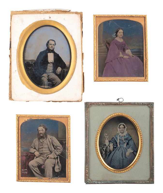 [EARLY PHOTOGRAPHY]. A group of 13 European daguerreotype and ambrotype portraits featuring applied color, including: