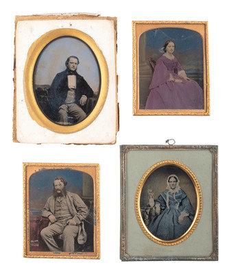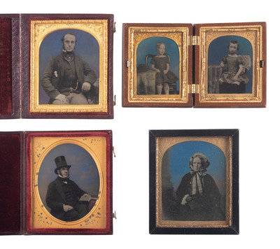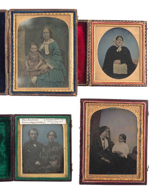 Quarter plate ambrotype portrait of a seated woman looking down at a young girl leaning on the arm of the woman's chair. (Image a bid dark, with faded color and minor spotting, oxidation to mat; unsealed.) Housed in a fully separated case. --Sixth plate ambrotype portrait of an older woman wearing a bonnet and holding open a book with one hand. (Light wear to color; unsealed.) Housed in a full leatherette case. The opened book features what appears to be an illustration on one page, and gold highlighting on the other. -- And 11 others, including 5 quarter plate abrotypes, 3 sixth plate ambrotypes, one sixth plate daguerreotype, and 2 ninth plate ambrotypes, some without cases. -- Together, 13 European portraits featuring applied color.