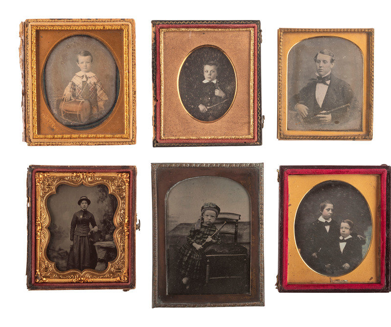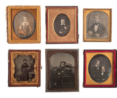 Sixth plate daguerreotype portrait of a young boy in plaid posed with a small drum. Trenton, NJ: Morris Moses, n.d. (Tarnishing to edges with further discoloration and clouding throughout and mild weeping glass effect, spotting to mat; original seals.) Housed in a half pressed paper case. Mat stamped for Moses. -- Quarter plate ambrotype portrait of a young child in Scottish attire leaning against a chair and holding onto part of what appears to be a set of bagpipes. (Some darkening to image, with some image loss to bottom portion and wear to edges; unsealed.) No case. -- And 4 others, including 3 sixth plate daguerreotypes and one sixth plate tintype. -- Together, 6 cased images featuring subjects with musical instruments.