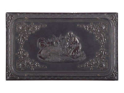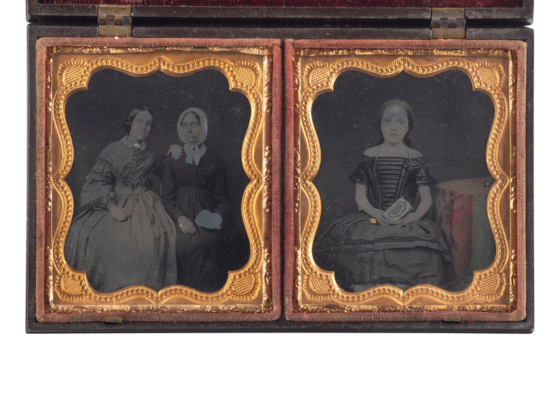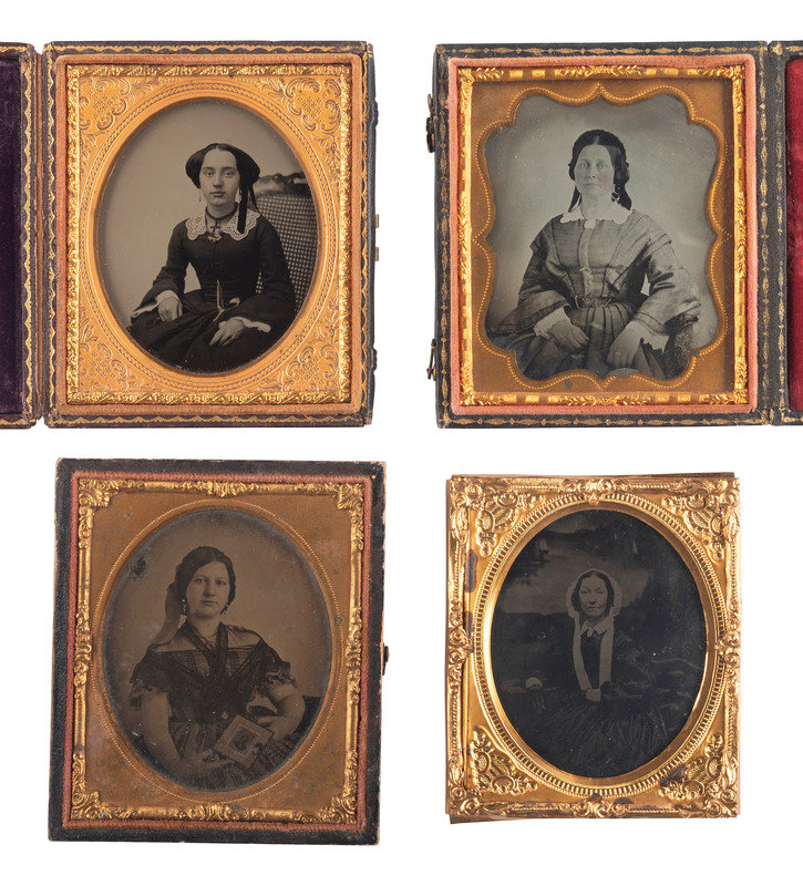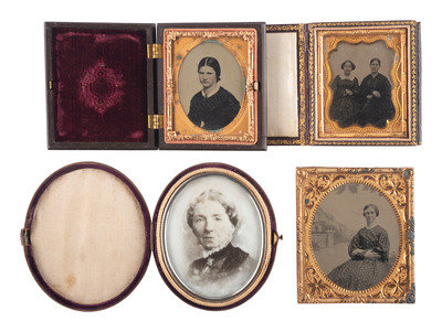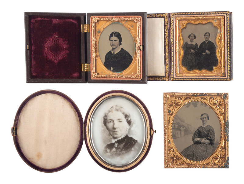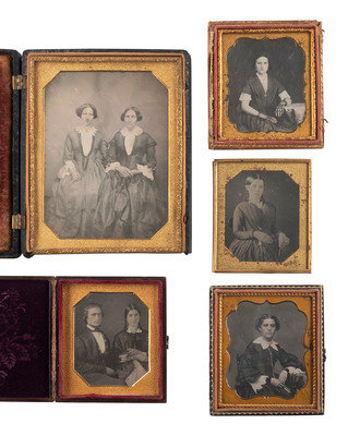 Half plate daguerreotype portrait of two women, likely sisters, seated together. (Light spotting, few small scratches and wipe marks; crudely resealed with transparent tape.) Housed in a floral Union case (bottom edge of back cover missing, non-functioning closure, heavy soiling.) -- Sixth plate ambrotype portrait of an identified young lady, wearing a beaded cross necklace. (Crisp, retains good contrast; original seals.) Housed in a pressed paper case (broken closure clasp). Penciled inscription in back of case reads, "Fannie Paine - at - 1856 Hartwick NY / When - 18 years old." -- Sixth plate ambrotype portrait of a lovely youg woman wearing fine clothing and holding a framed image of a gentleman in view of the camera. (Darkening, splotching, bits of image deterioration, spotting to mat and preserver; unsealed.) Housed in a half pressed paper case. -- And 17 others, including 4 sixth plate daguerreotypes, one quarter plate ambrotype, 7 sixth plate ambrotypes, 2 ninth plate ambrotypes, 2 sixth plate tintypes, and one oval portrait on milk glass, many wthout full cases. -- Together, 20 portraits of women, some housed in Union cases, a few with photographer identification.