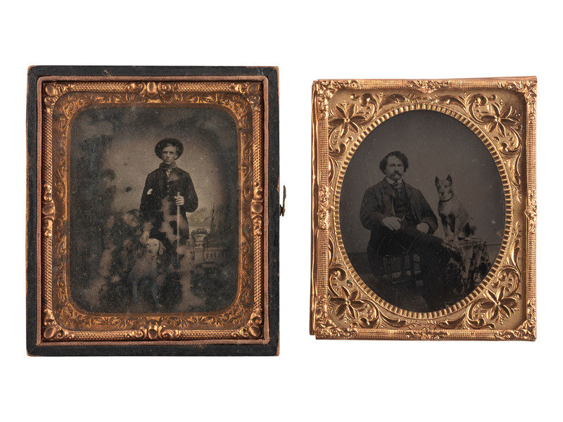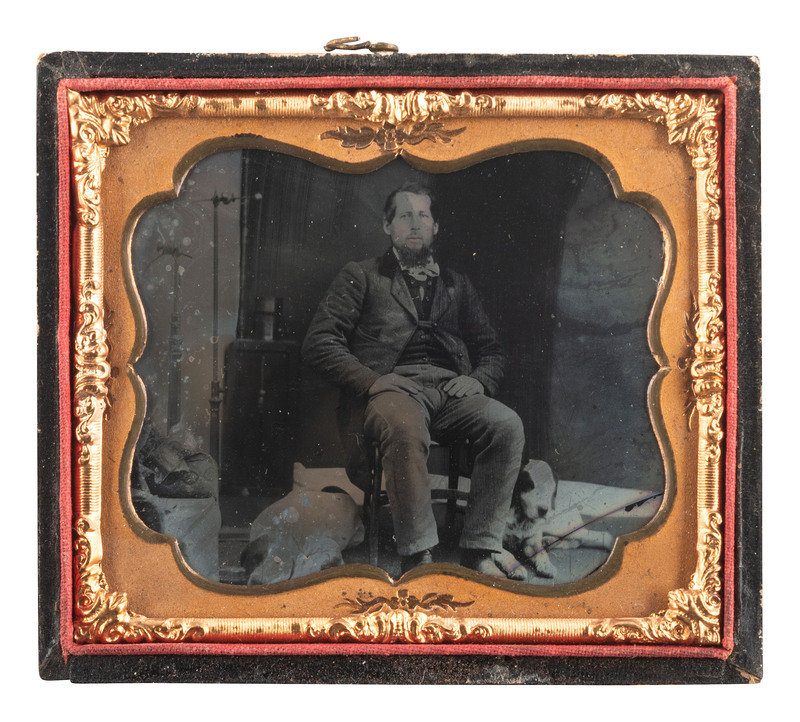 Sixth plate tintype portrait of a mustachioed gentleman with curly hair seated next to a table surmounted by a medium dog. (Surface crackling visible throughout plate; unsealed and housed under mat, glass, and preserver only.) No case. The subject also appears to be smoking a cigar. -- Sixth plate ruby ambrotype of a man seated with two dogs lying at his feet. (Significant crack to plate in lower right, image deterioration and discoloration to all edges; unsealed.) Housed in a half pressed paper case. The man sits in front of a large cloth backdrop, but studio props can be seen to one side. -- Sixth plate ambrotype portrait of a man posed standing before a painted backdrop with his trusty canine companion. (Significant image loss and very heavy flaking throughout, heavy spotting to mat and preserver; unsealed.) Housed in a half pressed paper case). The man appears to hold a firearm upright by the barrel in one hand, and to be touching the dog's head with the other. -- Together, 3 wet plate images of men with dogs.
