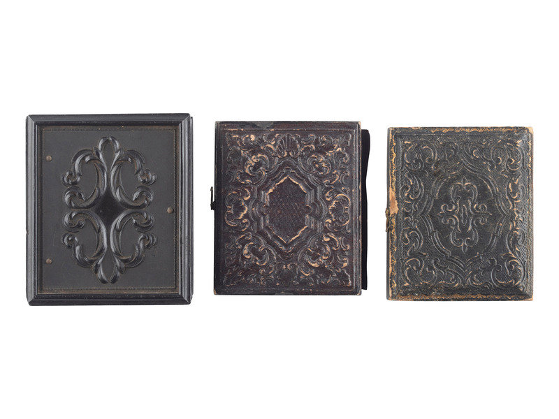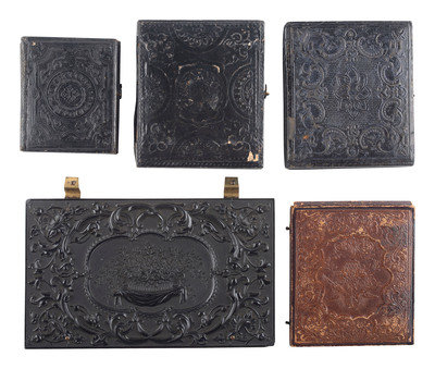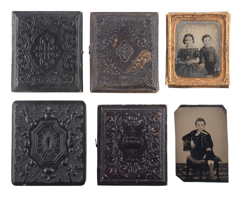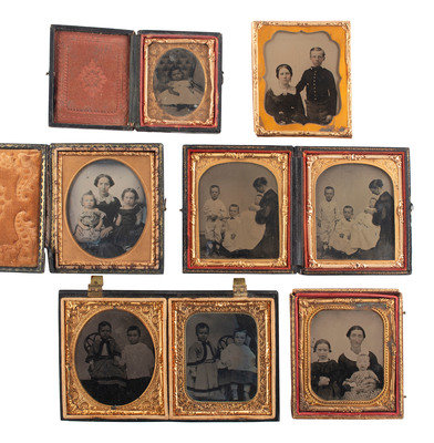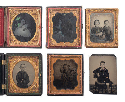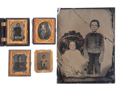 A pair of sixth plate tintypes of a mother and 3 children, taken in the same sitting. (Light blemishes; unsealed.) Housed together in a pressed paper case. -- Sixth plate ambrotype portrait of a disgruntled-looking young boy wearing a belted jacket suit. (Few scratches/spots of loss to image; unsealed.) Housed in a Union case with geometric design (chipping to edges, non-functioning closure clasp). -- Ninth plate tintype portrait of an African American baby seated in a large chair. (Some surface blemishes, creasing, and residue to plate; unsealed.) Housed in a pressed paper case (significant wear). -- And 15 others, including 7 sixth plate ambrotypes, 2 ninth plate ambrotypes, one full plate loose tintype, 3 sixth plate tintypes, and 2 ninth plate tintypes, some without cases. -- Together, 19 assorted portaits featuring children.